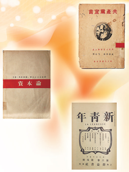 图片自上至下分别为《共产党宣言》《资本论》的早期译本以及刊登李大钊《我的马克思主义观》一文的《新青年》杂志。