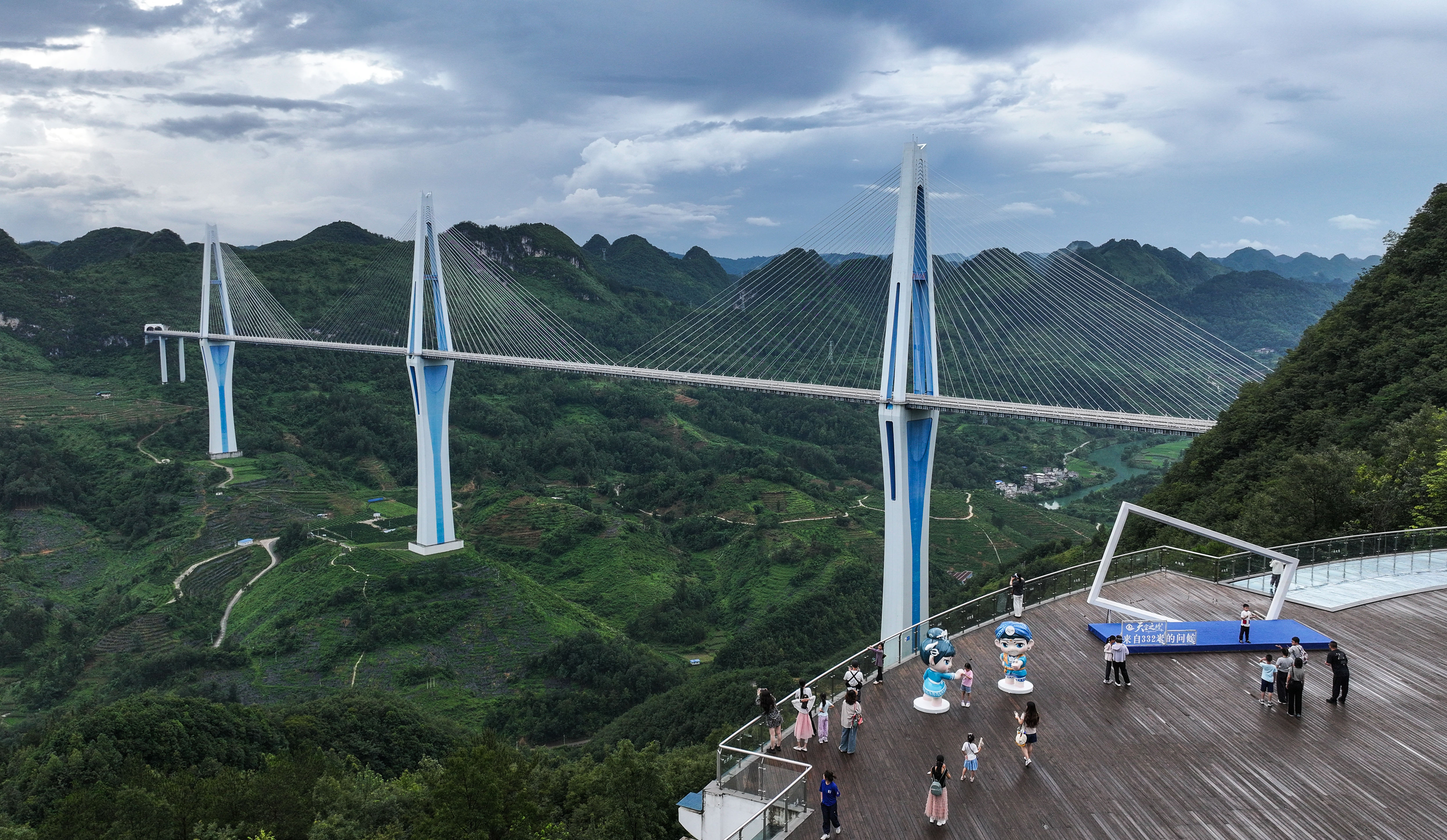 游客在贵州省平塘县“天空之桥”服务区观光,享受贵州特有的“桥旅融合” 杨文斌∕摄